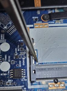 Le premier réflexe dans cette situation est souvent de tester les composants de base. J’ai donc commencé par examiner la mémoire vive (RAM). Le PC possédait un slot de ram et de la ram soudée directement à la carte mère. En enlevant la barrette du slot, miracle ! L’ordinateur portable a démarré sans problème.